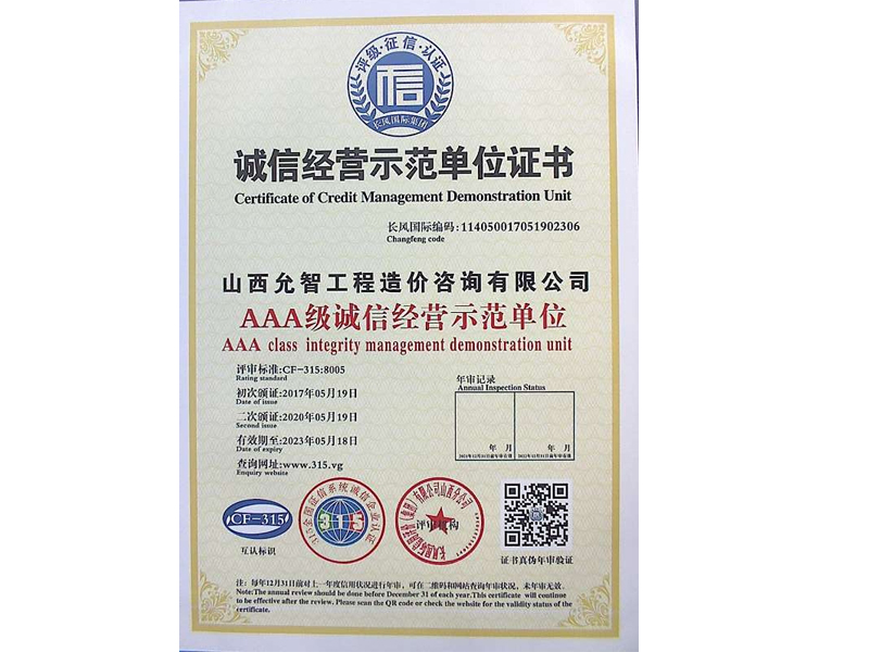 誠信經營示范單位證書