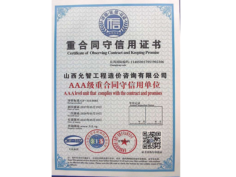 重合同守信用證書